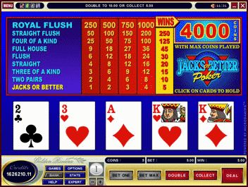 Le but du jeu est d’obtenir n'importe laquelle des combinaisons de mains gagnantes de poker. Les combinaisons gagnantes et le tableau des gains sont affichés sur la machine. Le jeu Le joueur insère des jetons dans la machine pour placer sa mise. La mise doit être faite avant que les cartes soient distribuées et ne peut être modifiée après que le jeu est lancé. Après avoir misé, le joueur appuie sur le bouton marqué « Draw/Deal » (donner/distribuer), ceci fait apparaître les cinq cartes initiales. Le joueur décide alors quelles cartes il désire conserver dans sa main. Il appuie ensuite sur le bouton « Hold/Cancel » (retenir/annuler) sous les cartes qu’il désire garder. S’il change d’avis et ne désire plus garder une carte déjà retenue, le joueur appuie une deuxième fois sur le bouton « Hold/Cancel » et la retenue sera annulée. Le joueur doit s’assurer de recevoir à l’écran la confirmation que ce sont les bonnes cartes qu’il retient ; le mot « hold » (retenir) clignote sous les cartes retenues. Le joueur appuie ensuite une deuxième fois sur le bouton « Draw/Deal » (donner/distribuer) pour recevoir des cartes pour remplacer les cartes non retenues. S’il obtient une main gagnante, la machine paie et est maintenant prête pour le jeu suivant. Les mains suivantes sont gagnantes et sont listées dans l’ordre, de la plus forte à la plus faible respectivement : La quinte royale (Royal Flush) C’est la plus haute main possible au poker. La quinte royale comprend l’as, le roi, la reine, le valet et le 10 de la même couleur. La quinte couleur ou quinte flush (Straight Flush) C’est la deuxième plus haute main possible. La quinte couleur est composée de cinq cartes en ordre et de la même couleur ; (notez que l’as peut habituellement être compté comme plus petite carte de la quinte) par exemple, la combinaison A, 2, 3, 4, 5 représente un groupe de cinq cartes en ordre. Le carré (Four of a Kind) Cette main est composée de quatre cartes de la même valeur plus une autre carte (par exemple R, R, R, R, 3). La main pleine ou full (Full House) Cette main comprend trois cartes d’une même valeur (un brelan) plus deux cartes d’une même valeur autre (une paire) (par exemple V, V, V, 4, 4 ou 6, 6, 6, 8, 8). La couleur (Flush) Cette main est composée de cinq cartes de la même couleur, mais de rang différent (par exemple 4 de pique, 5 de pique, 7 de pique, reine de pique et as de pique) La quinte (Straight) La quinte est composée de cinq cartes en ordre, mais de couleurs différentes (par exemple l’as de carreau, 2 de pique, 3 de cœur, 4 de trèfle et 5 de pique). Le brelan (Three of a Kind) Il s’agit d’une main comprenant trois cartes de même valeur et deux autres cartes (telles que 7, 7, 7, A et 2). Deux paires (Two Pair) La paire est composée de deux cartes de même valeur ou rang. Cette main comprend deux paires et une autre carte (par exemple 6, 6, 7, 7, 2). La paire (Jacks or better) La paire est composée de deux cartes de même valeur ou rang ; au vidéopoker, seules les paires de valets, de reines, de rois ou d’as peuvent gagner.